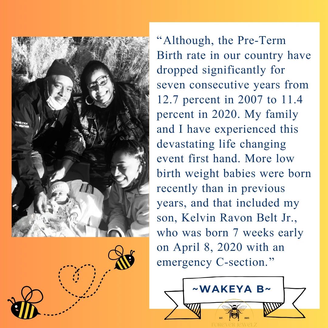 " Many may not be able to prevent pre-term birth under certain circumstances. However, there is much that can be done to promote a healthy full-term pregnancy; by seeking regular prenatal care visits, and following doctors orders in which I did great during my first and second trimesters. Complications didn’t arise until my third trimester. It is important to eat and maintain a healthy diet, which is a part of my current lifestyle, and also managing chronic conditions that would increase the risk of pre-term births such as diabetes, high blood pressure, and obesity. During my pregnancy I experienced elevated blood pressures that was the contributing factor to my pre-term birth delivery". ~Wakeya~